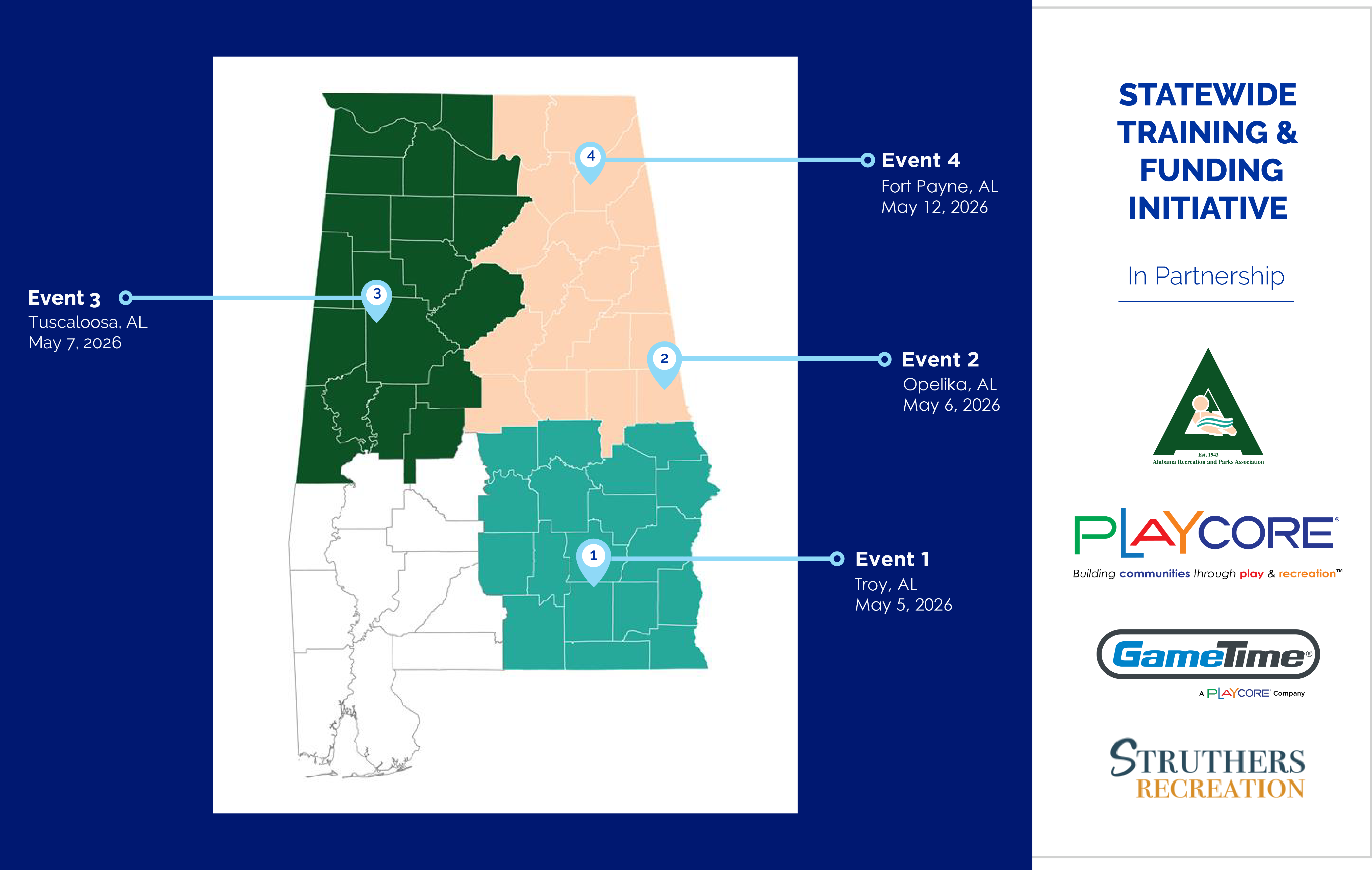 ARPA, PlayCore, GameTime, and Struthers Recreation have joined forces through the Statewide Healthy Play Initiative to enrich the quality of life in communities across Alabama. At the heart of this effort is ARPA mission to bring people together, support park and recreation professionals, champion investment in community spaces, and ensure strong leadership so that parks and programs can continue to enrich lives across Alabama.