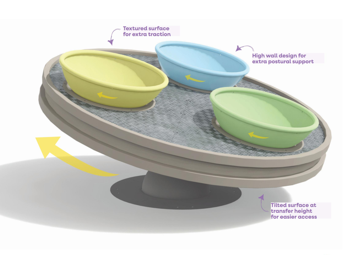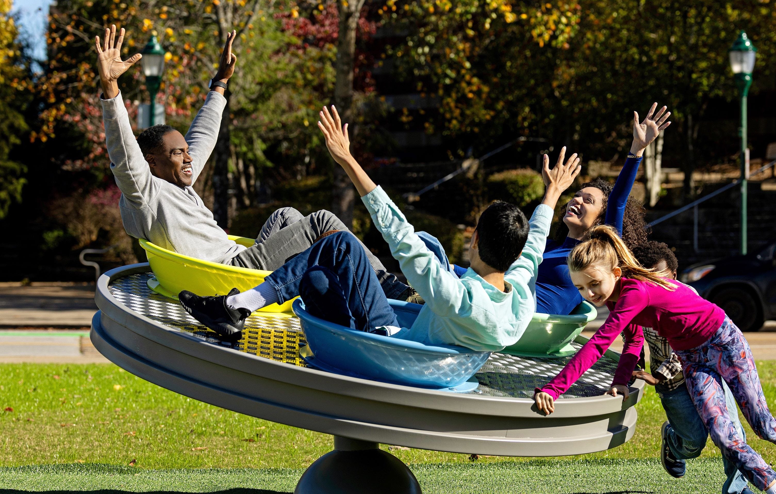 Take the Aurora for a spin! This whimsical attraction features three colorful spinning bowls atop a tilted turntable, offering excitement for both children and their caregivers alike. Each bowl spins independently while the whole turntable spins. The real magic unfolds as riders spin in their bowls, glancing to either side to share in the smiles of their loved ones with every turn.