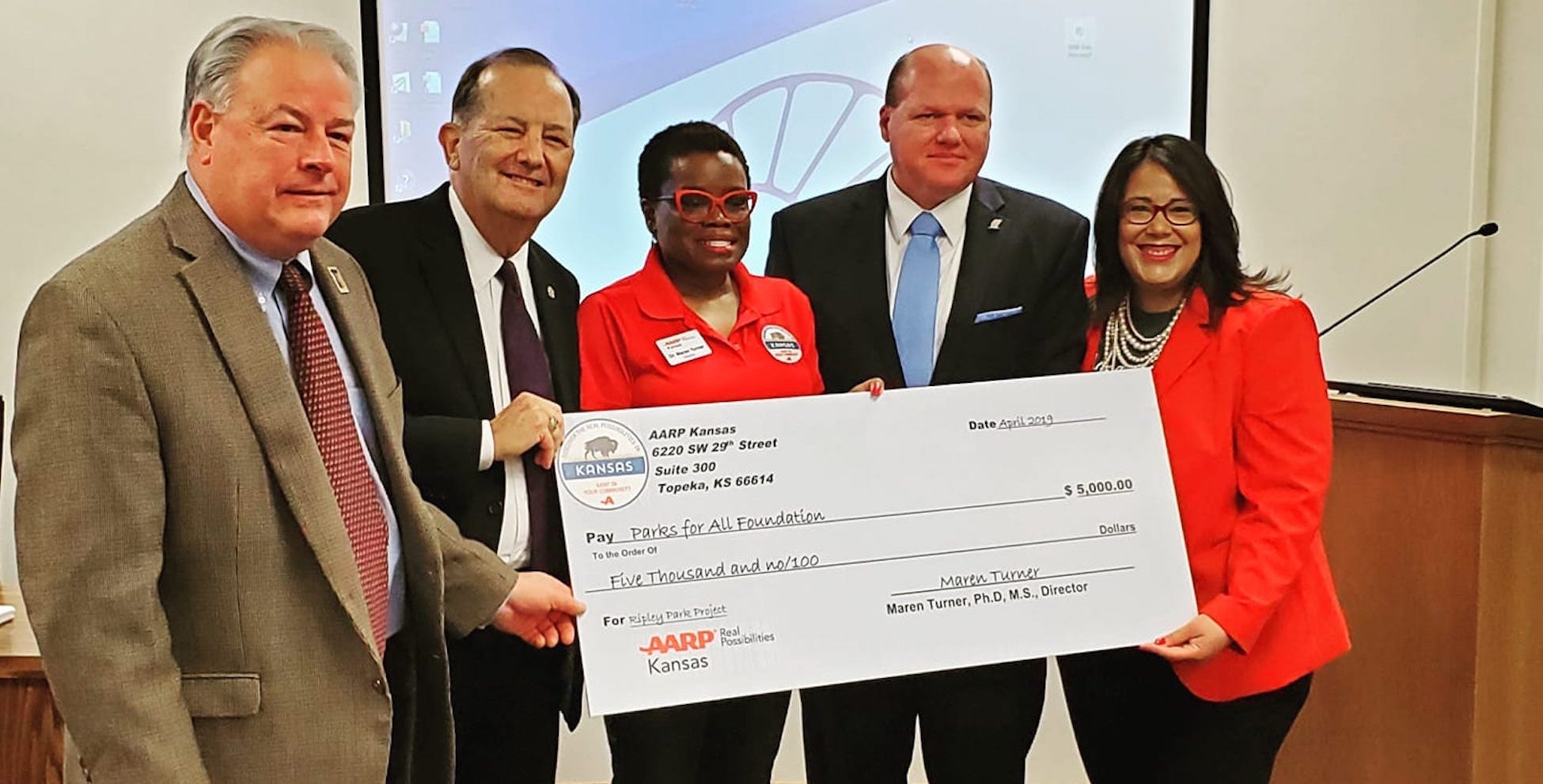 AARP of Kansas Director Dr. Maren Turner presented Topeka Mayor Michelle De La Isla and Shawnee Commissioners with a $5,000 check for the addition of Expression Swings for Ripley Park