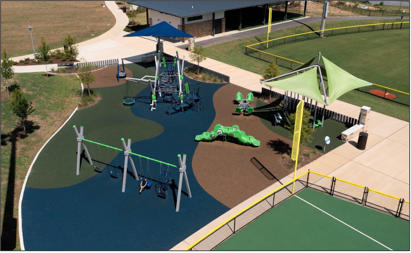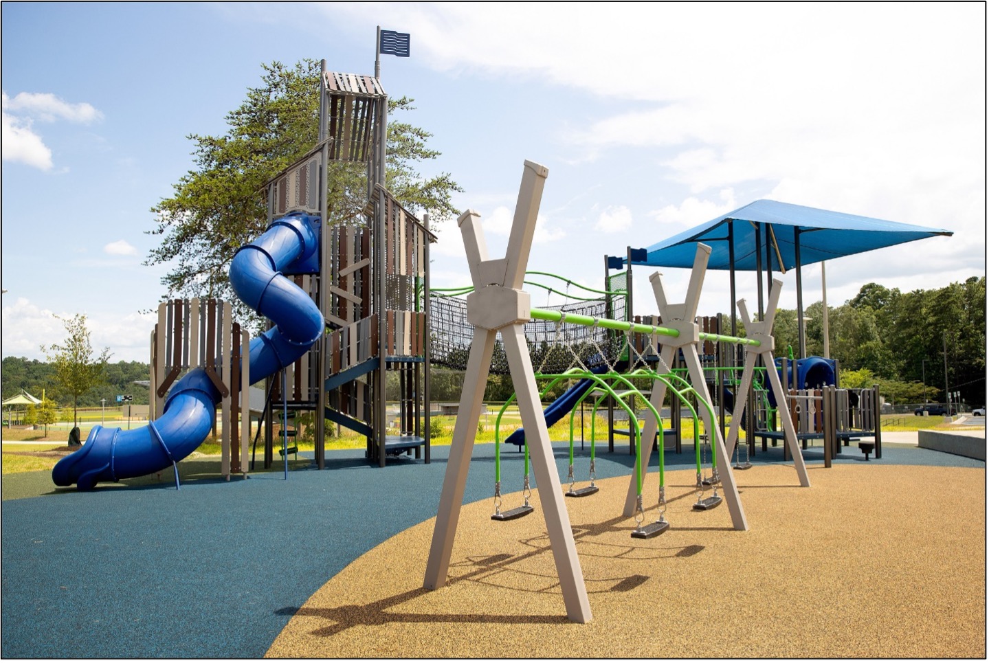 After completing the concept for the park, the installation team went to work. The playground was installed by Struthers Recreation, GameTime's exclusive representative in Alabama. Struthers Recreation created a play area at the upper side of the park that includes: the following: