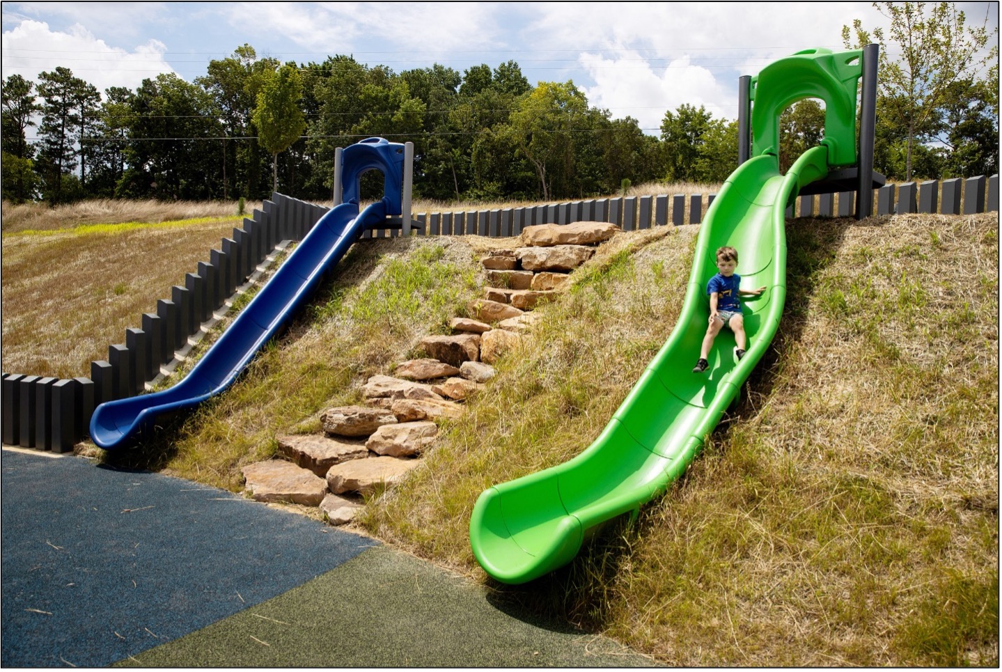 Part of the park's renovation includes a custom play and recreation space with two playgrounds, a fitness area for adults, and extra amenities like climbing mounds and hillside slides. Working with the visionary landscape architect Lea Ann Macknally, GameTime's custom design team and Struthers Recreation created a place to play as unique as Vestavia Hills itself.