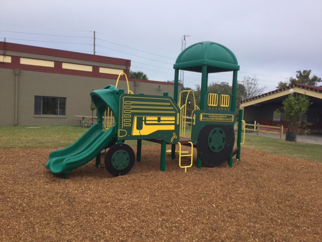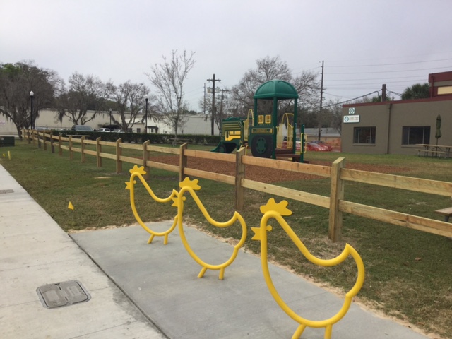 The city worked with the Ocala Downtown Business Alliance to convert a green space near the market into a pocket park, complete with a tractor themed playground, designed by GameTime's exclusive representative in Ocala, Dominica Recreation Products. Framing the playground are chicken-shaped bike racks and a landscape of fruit and olive trees.