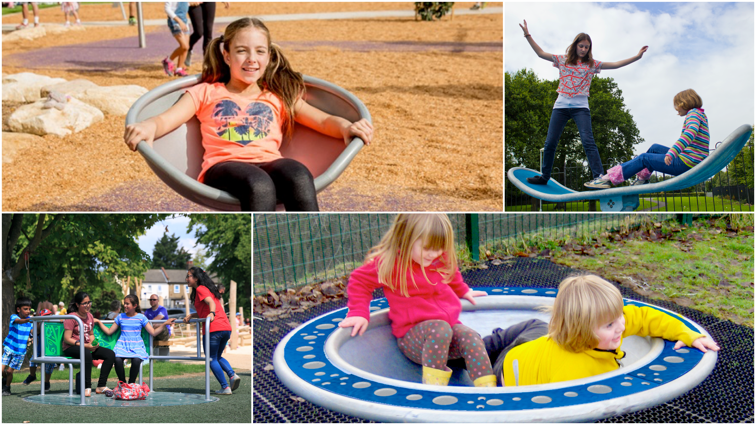 (Inclusive Play® products in the expanded partnership with GameTime, clockwise from top left: Infinity Bowl, Surf Board, Inclusive Whirl, Fusion)