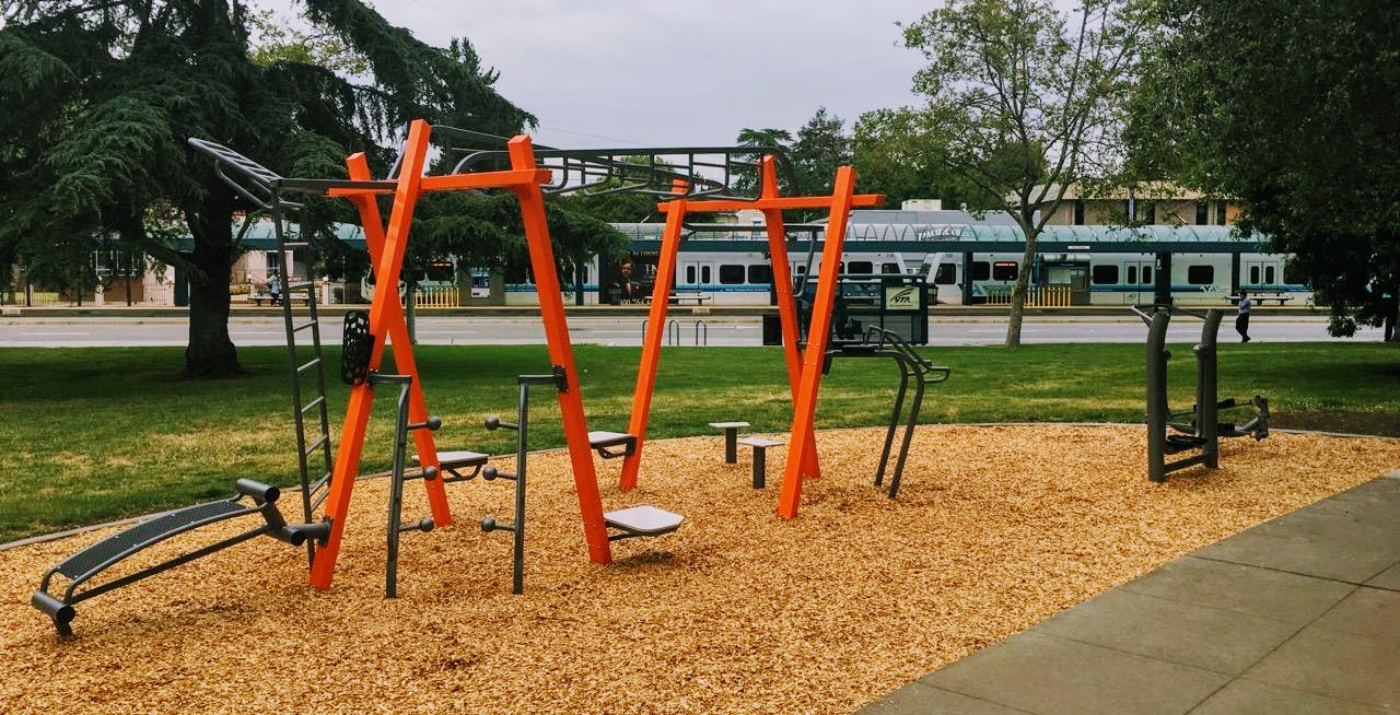 GameTime fitness equipment is highly visible across the street from the Santa Clara light rail station