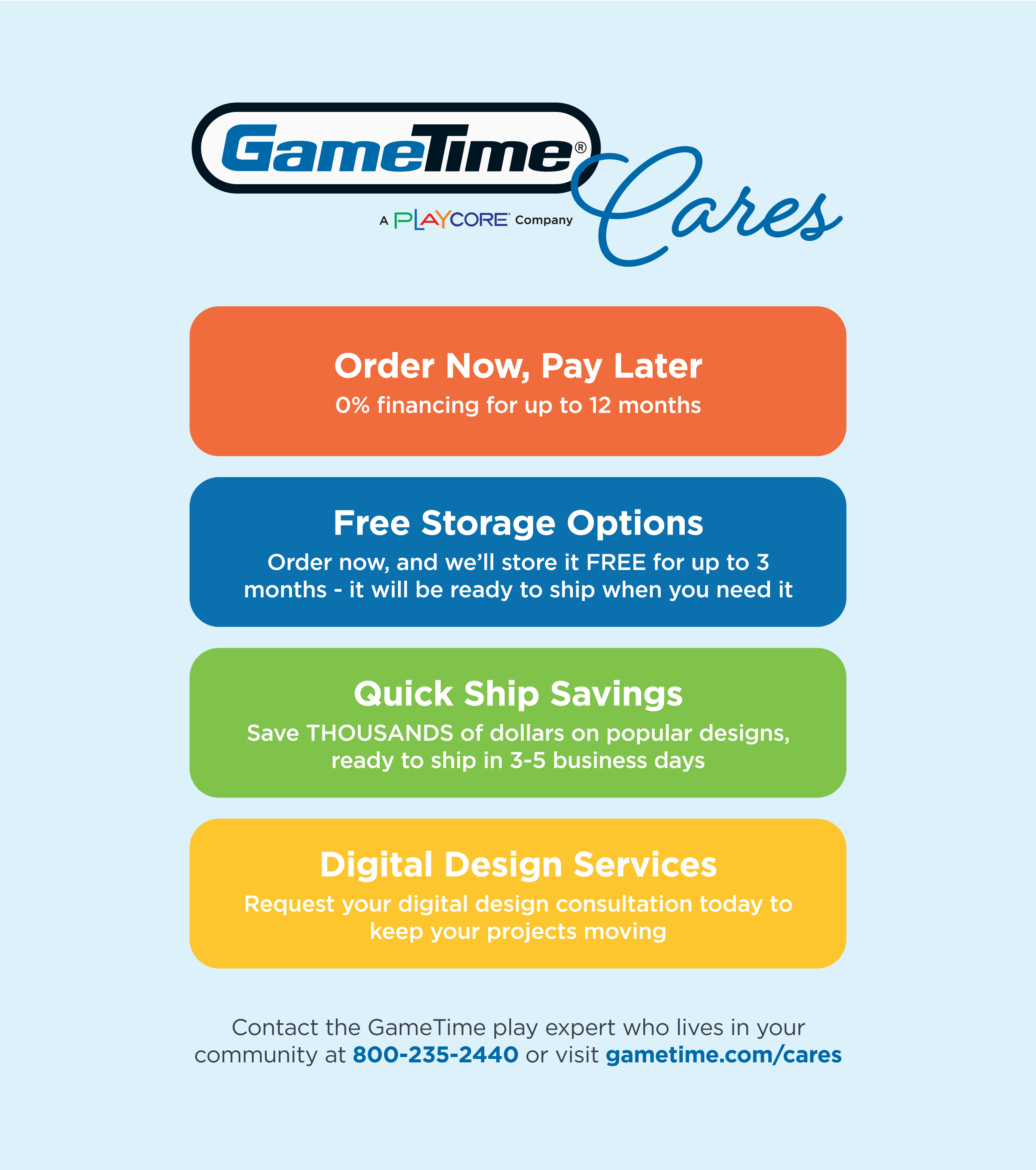 GameTime is pleased to announce GameTime Cares™, a multifaceted program to help customers plan play and recreation projects during difficult and unprecedented times. We've heard from many people who tell us they need some assistance with play and recreation projects. To help you plan for what's happening right now, and for what happens next, we’re providing four options to support you, including 0% financing for 12 months, up to 90 days of free storage, Quick Ship play systems that ship in 3-5 working days, and comprehensive design and planning assistance.