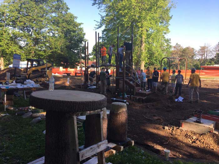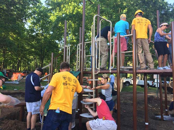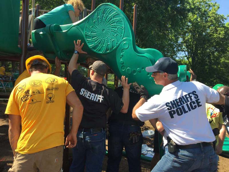 On June 9, 2017 the Play4ALL campaign of Cunningham Recreation, GameTime's exclusive representative in Illinois, accomplished its third Healing Communities Through Play ™ project in Rockford, IL. Together with the Rockford Parks Dept., Rockford PD, County Sheriff’s office, and Sharefest volunteers, a brand new playground was built in Levings Park. Local installer, Custom Playgrounds, generously donated their labor and equipment to prep the land and to supervise the volunteer driven build.