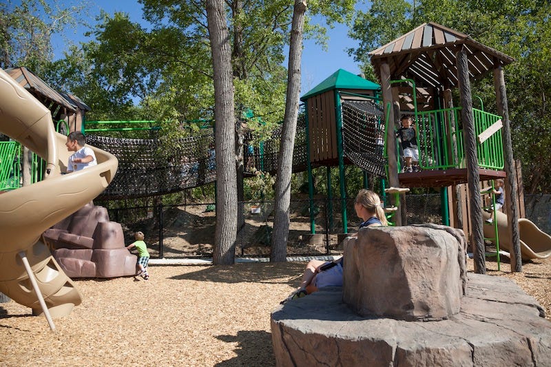 One of the park’s features that contributed to its recognition and award, is a unique, nature-themed playground built by GameTime and its Landmark Design custom play division. Landmark Design designed custom play sculptures that complemented the natural landscape. A giant tree stands at the front of the playground with themed slides and ladders. Custom rock and vine climbers are designed to mimic the look and feel of a natural forest setting. The centerpiece of the playscape is a series of custom, elevated nets that allow children to leave the play structure and explore the wooded areas beyond the playground.