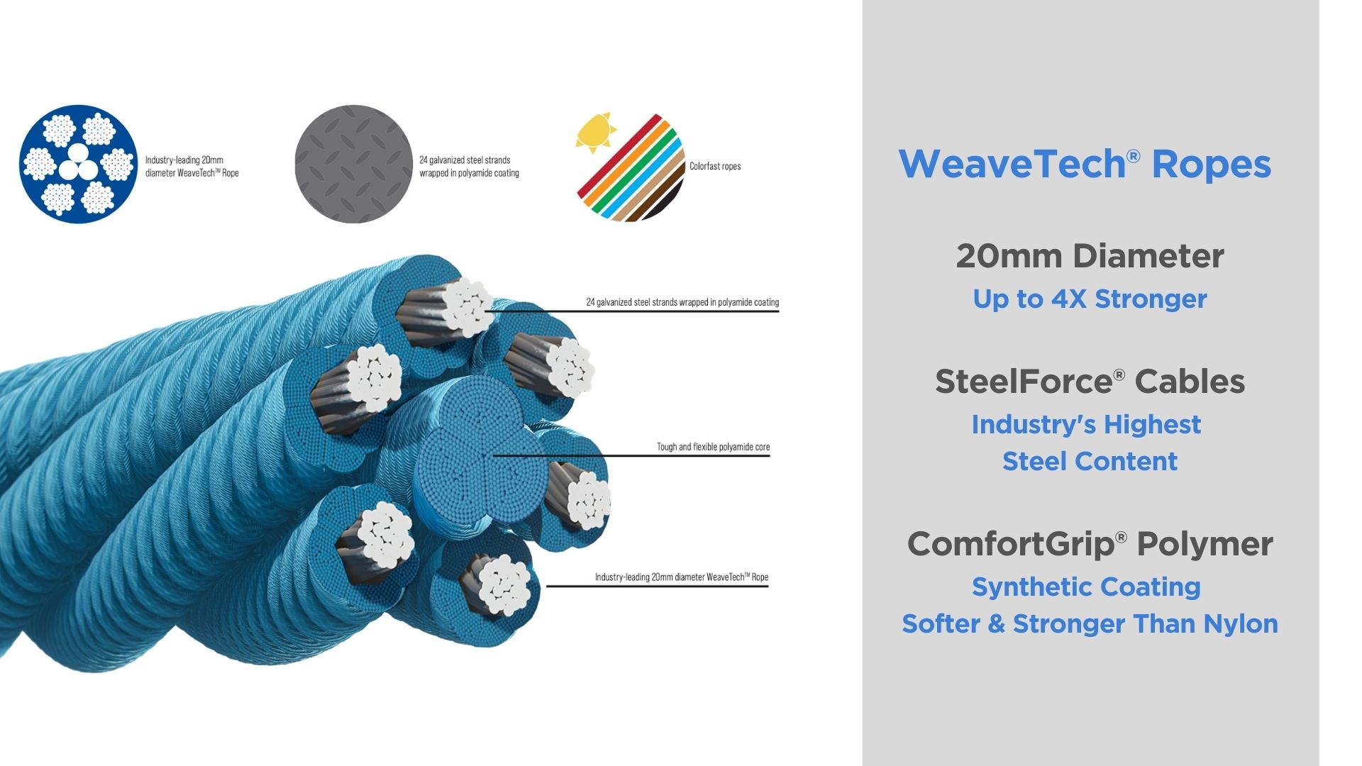 GameTime's VistaRope playground nets use WeaveTech cabling systems. These super-durable ropes contain the industry's highest steel content and are coated with our ComfortGrip® synthetic polymer. ComfortGrip is more durable than nylon and softer to the touch.