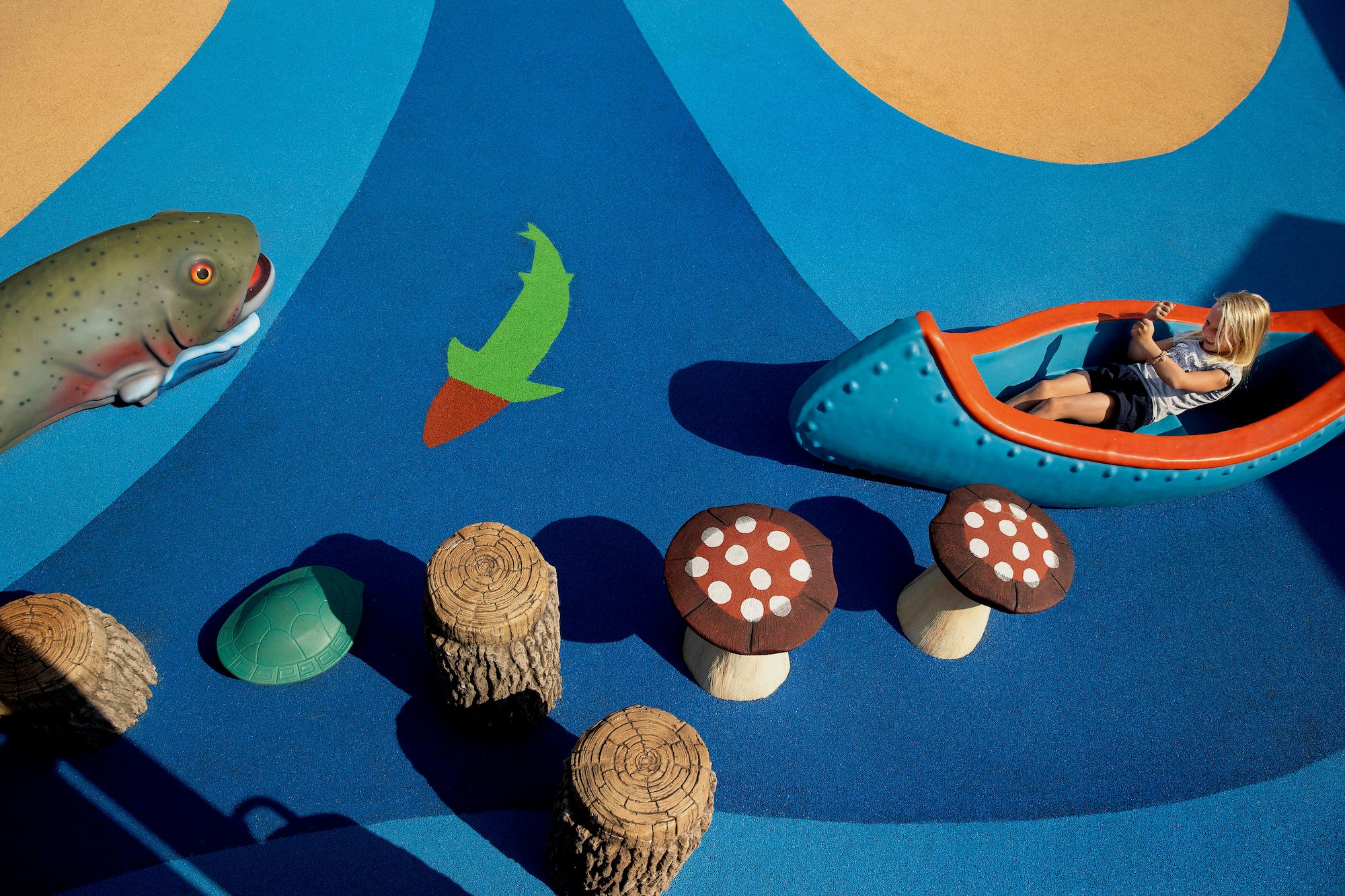 Additionally, the unique surfacing pattern and combination of synthetic turf and poured-in-place rubber allow the play area to really come to life. “This created a natural-feeling landscape that makes it feel like you really are in a different place, and it adds a richness to the playground,” said Painter.