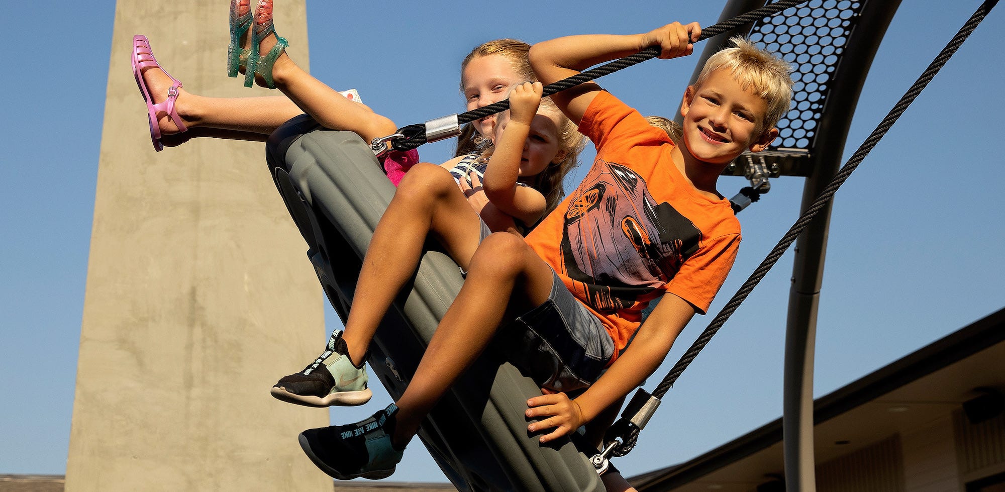 Landmark Design, GameTime’s custom play division, developed the themed elements. Throughout the playground, you’ll see multiple custom play elements that make you feel like you’re walking along a river in British Columbia. Younger kids can enjoy the canoe climbers and fish head stepping stones, while the older kids jog back and forth on the rope bridges suspended over the “river.”
