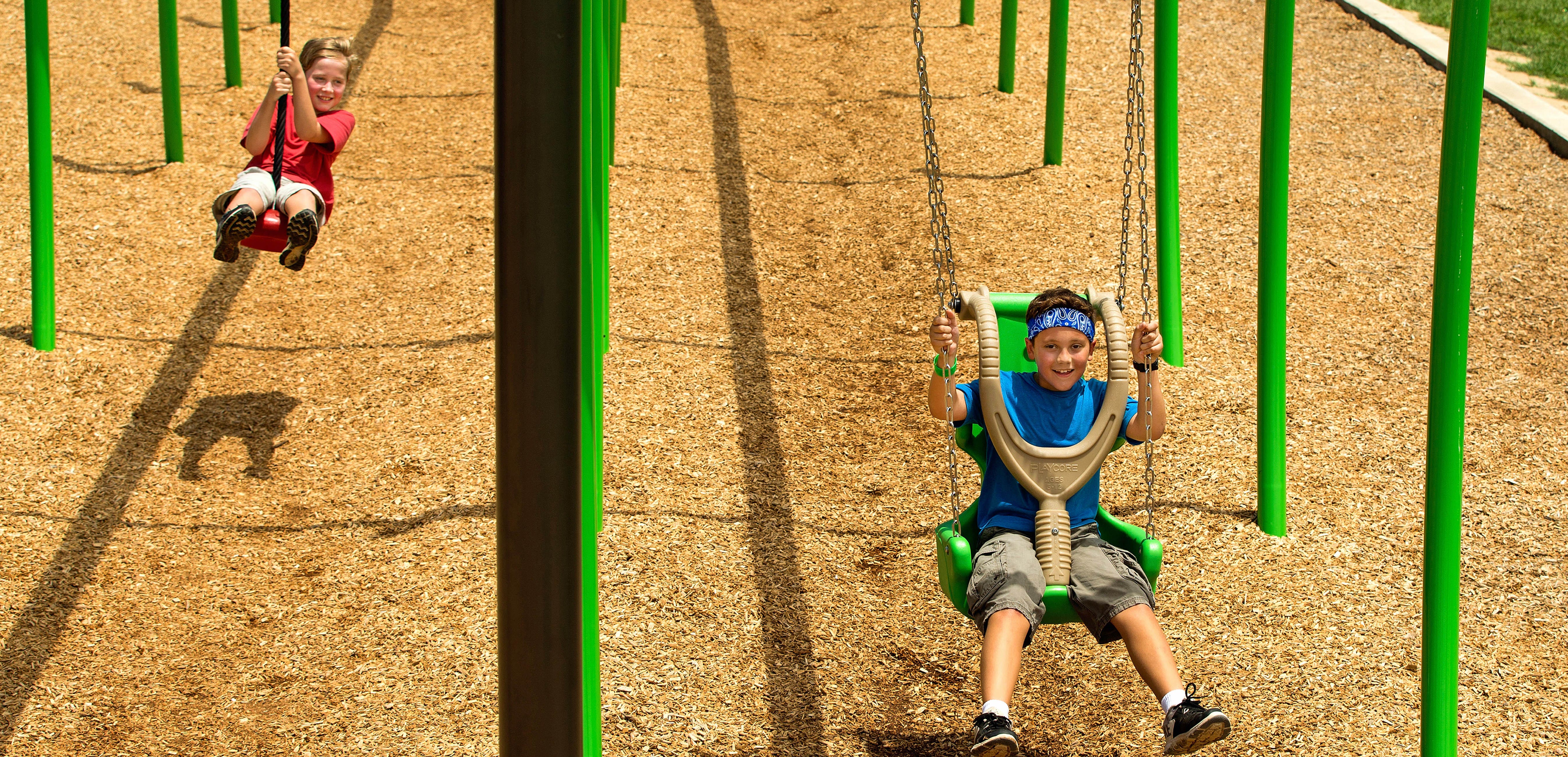 Many children need additional trunk support when using motion play activities, such as whirls or swings. Include play products that offer molded seats that are comfortable and accommodating for a wide range of ages and body types. Also provide products that feature high backs or side rails to help children maintain an upright position during play. These accommodations help children of all abilities to play together.