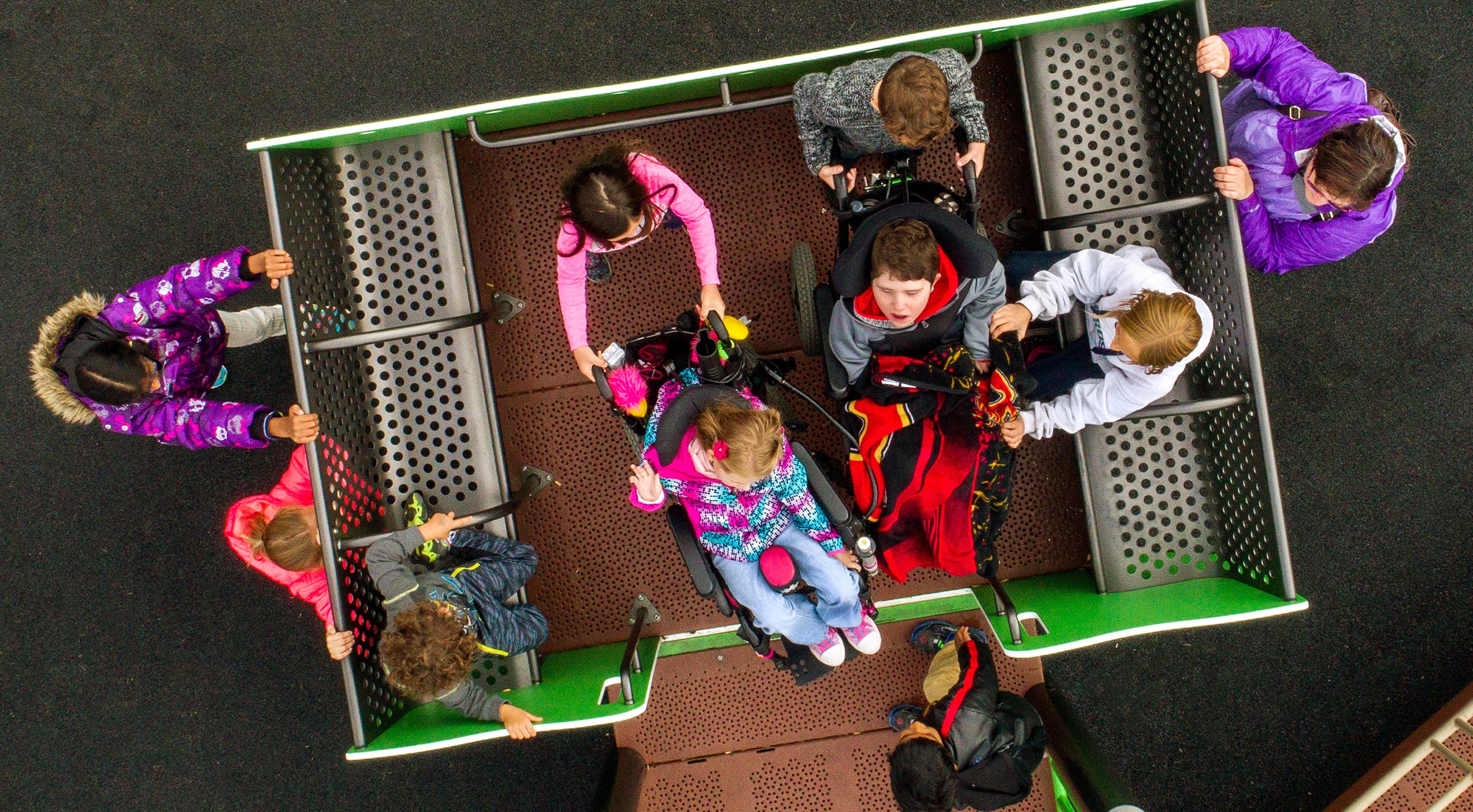 As in most places, people need space to feel comfortable. On a playground, that means planning an appropriate amount of space for multiple users to engage in a play activity, assistive devices/equipment used by people in, on and around the playground, and/or personal assistance both on a play structure and at ground level.