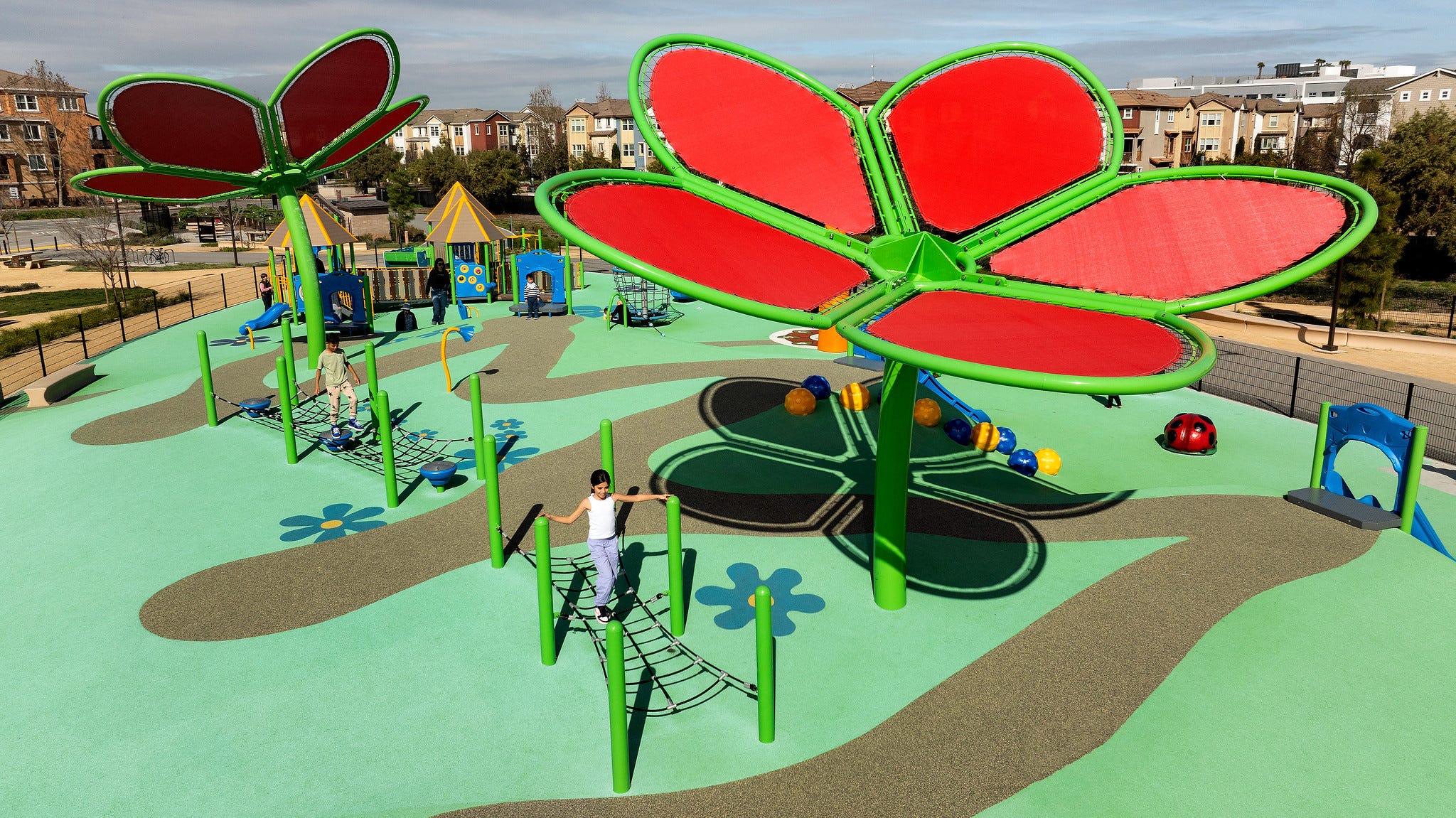 Delano Manongs Park embraced a creative approach to their shade structures by designing them as giant flowers, complementing the park's nature theme. These structures enhance the park's overall narrative and add to its storytelling.