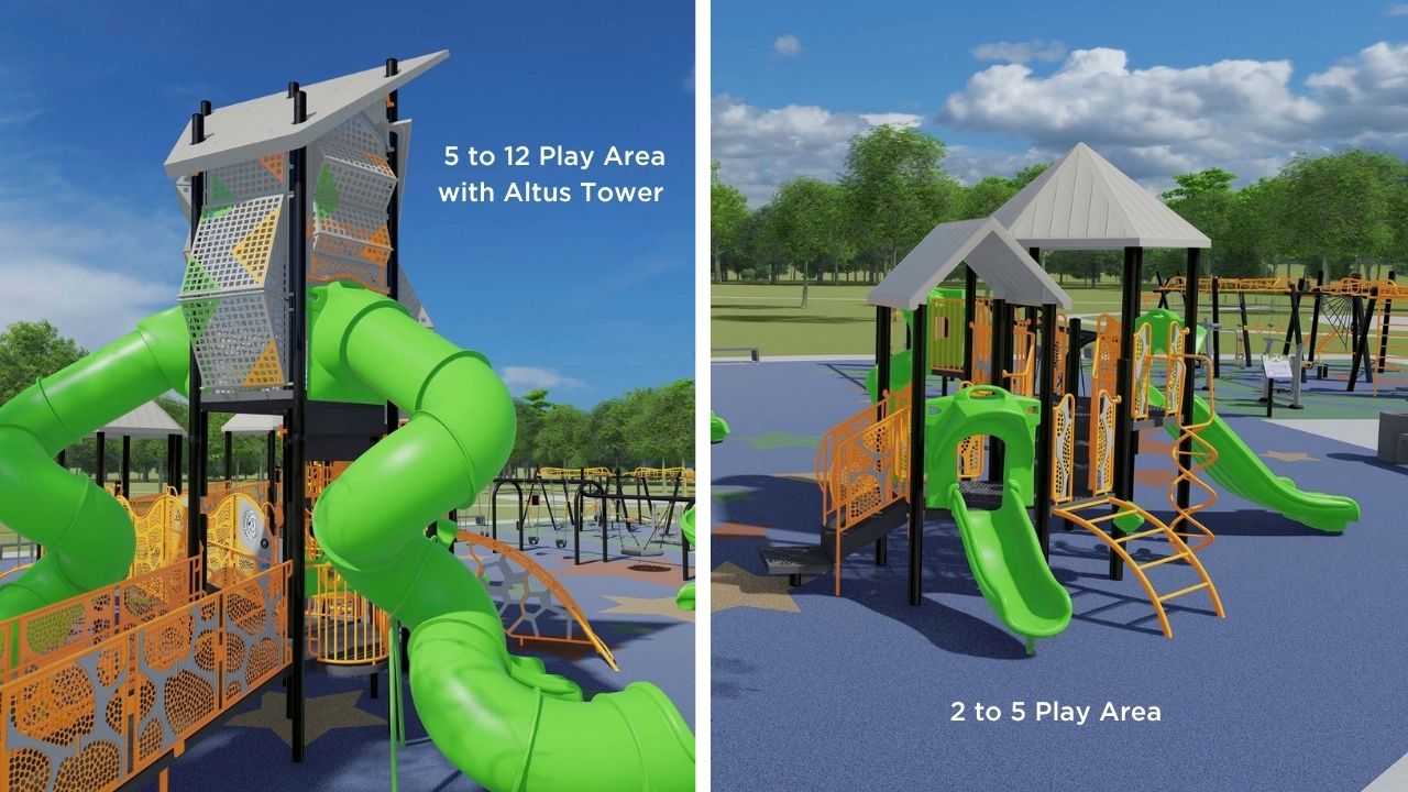 The playground at Beattie Park features an Altus Tower and play areas for ages 2 to 5 and 5 to 12