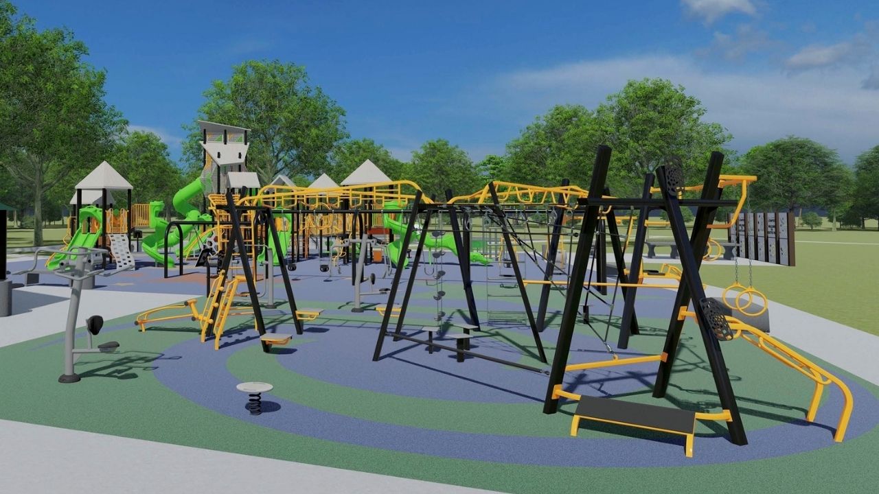 In addition to the playground equipment, the 50-acre park now includes the THRIVE 900 outdoor fitness system, which allows up to 20 people to achieve a full-body workout at the same time.