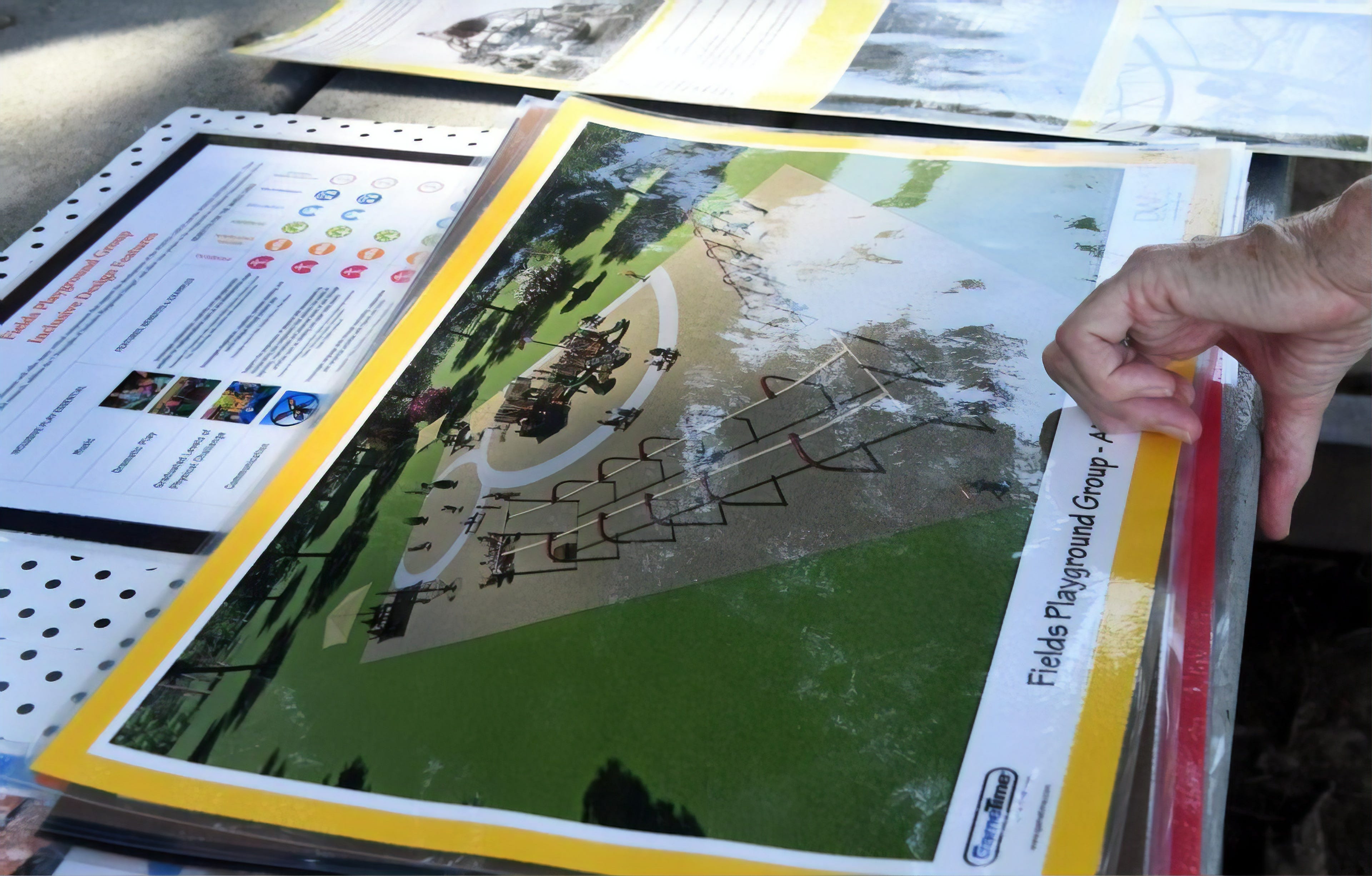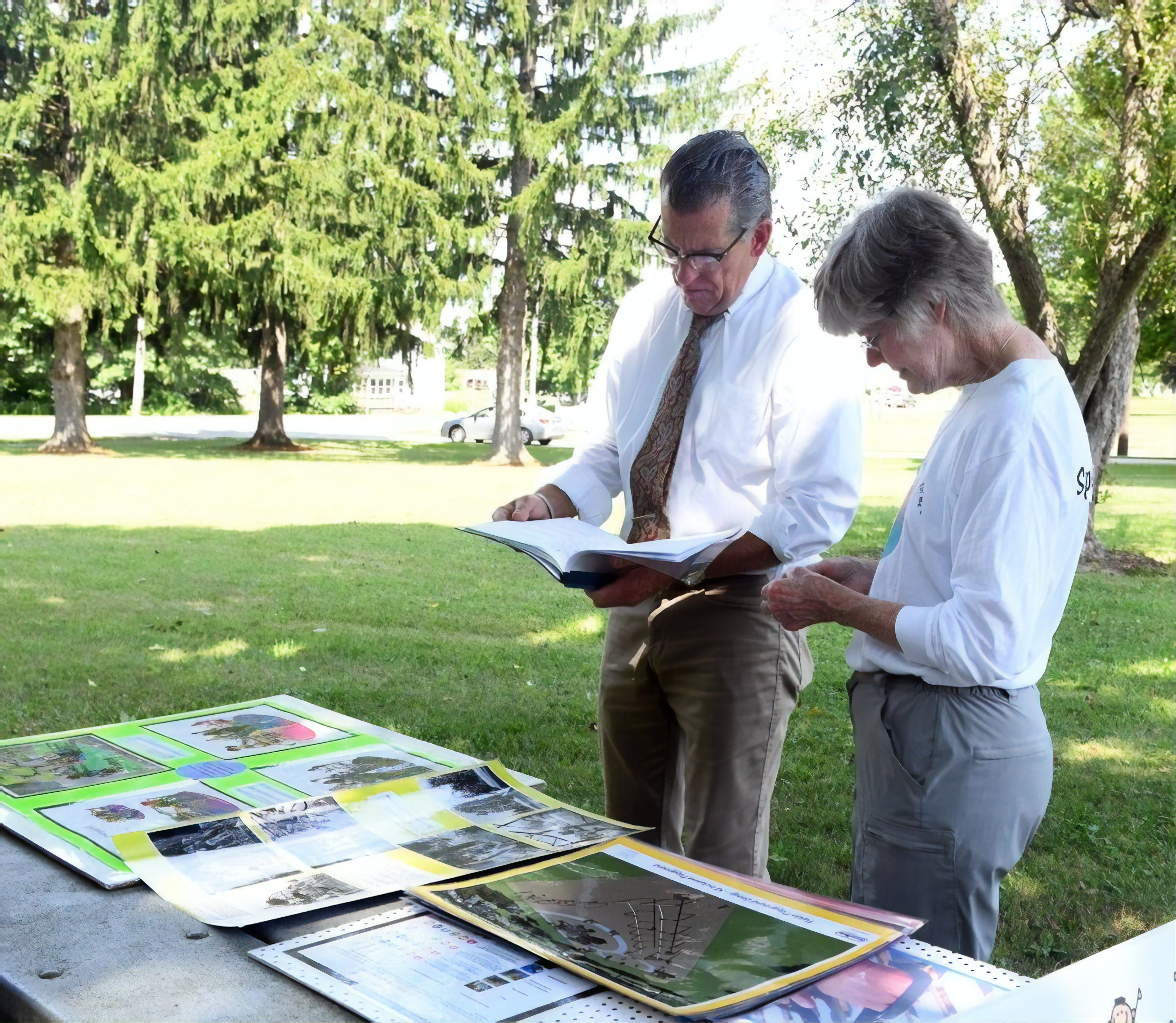 Ohio State Senator John Ecklund and Fields Playground Group President Susan Monegan review research and plans for the new inclusive playground (photo by Lisa Scalfaro)