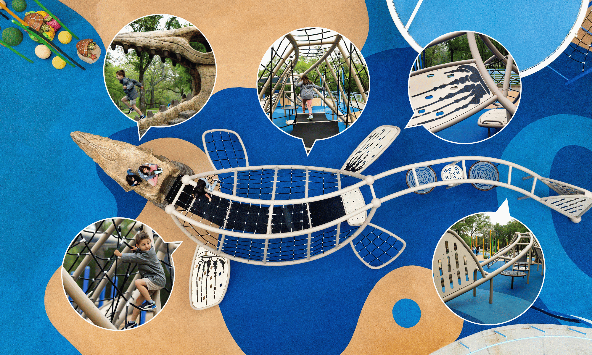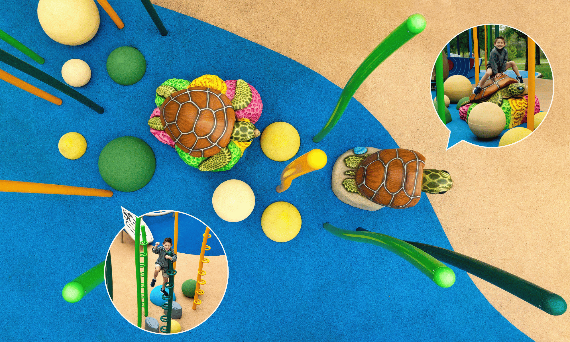 Sprout Climbers are installed at varying heights and colors, creating the illusion of a vibrant coral reef. Adding to the scene, a custom GFRC sea turtle rests atop its own bed of coral, inviting children into a world of underwater adventure. Playful climbing spheres and half-spheres from our Playful Landscapes collection add extra dimension and character to the space, encouraging further exploration. The entire environment comes to life with custom poured-in-place (PIP) surfacing, artfully colored to resemble sandy shores and rolling ocean waves.