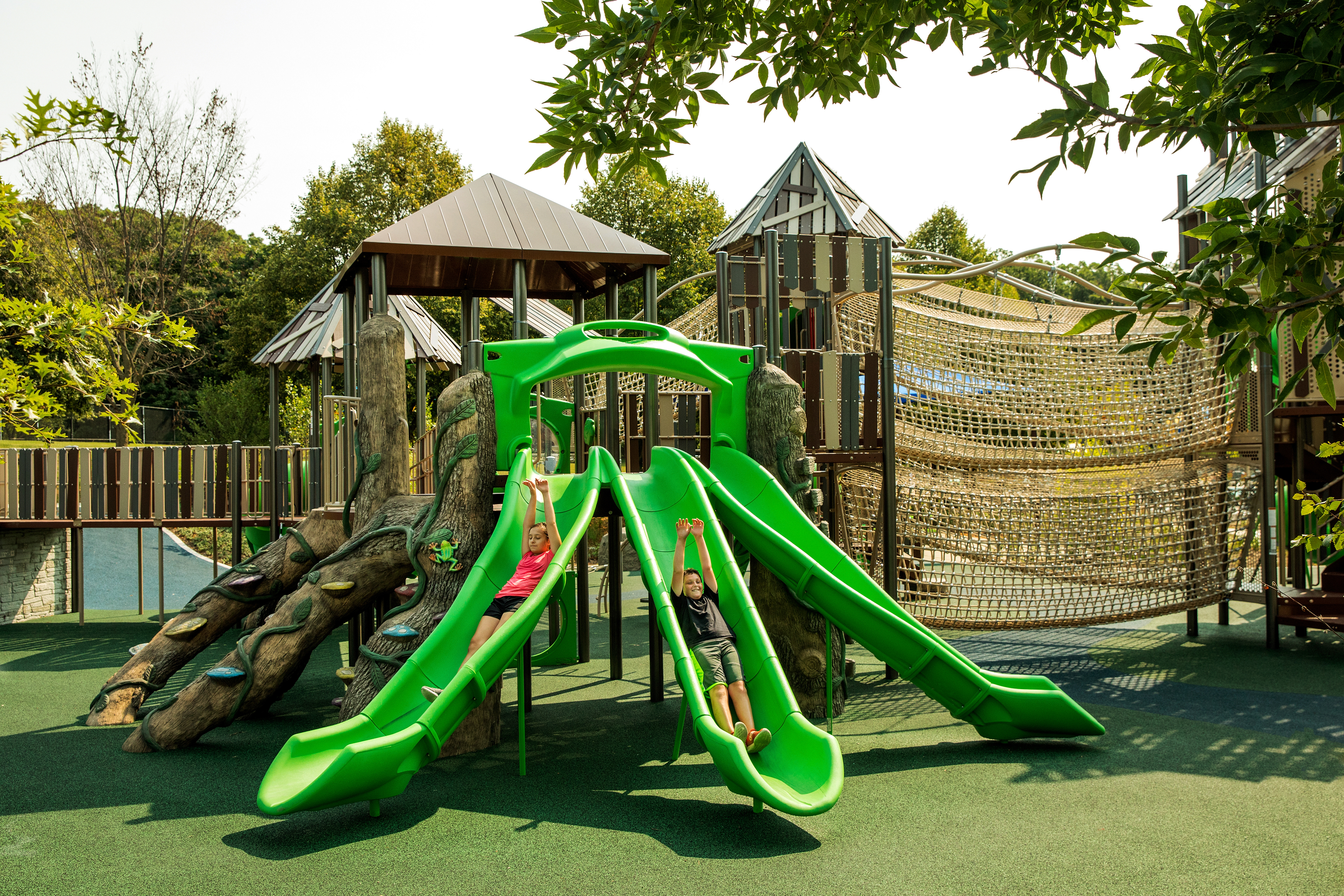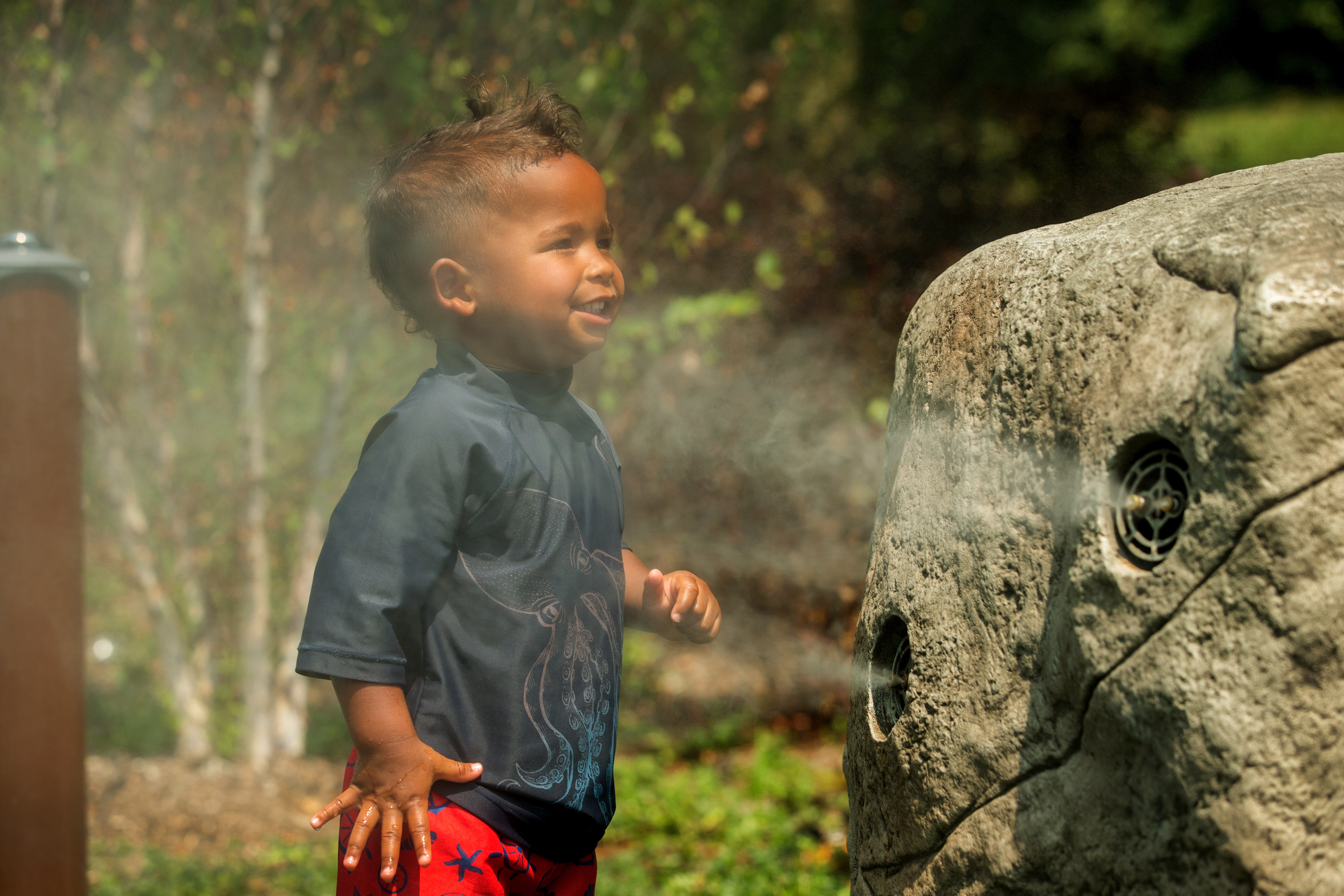 Down below there are cozy spots for gathering, resting and observing play, accessible rubber safety surfacing, a surface level trampoline and ground-level play activities. There are plenty of roofs and shaded areas for relief from sunny days, as well as rock climbers that spray super fine mists of water to cool things down when the mercury is really on the rise.