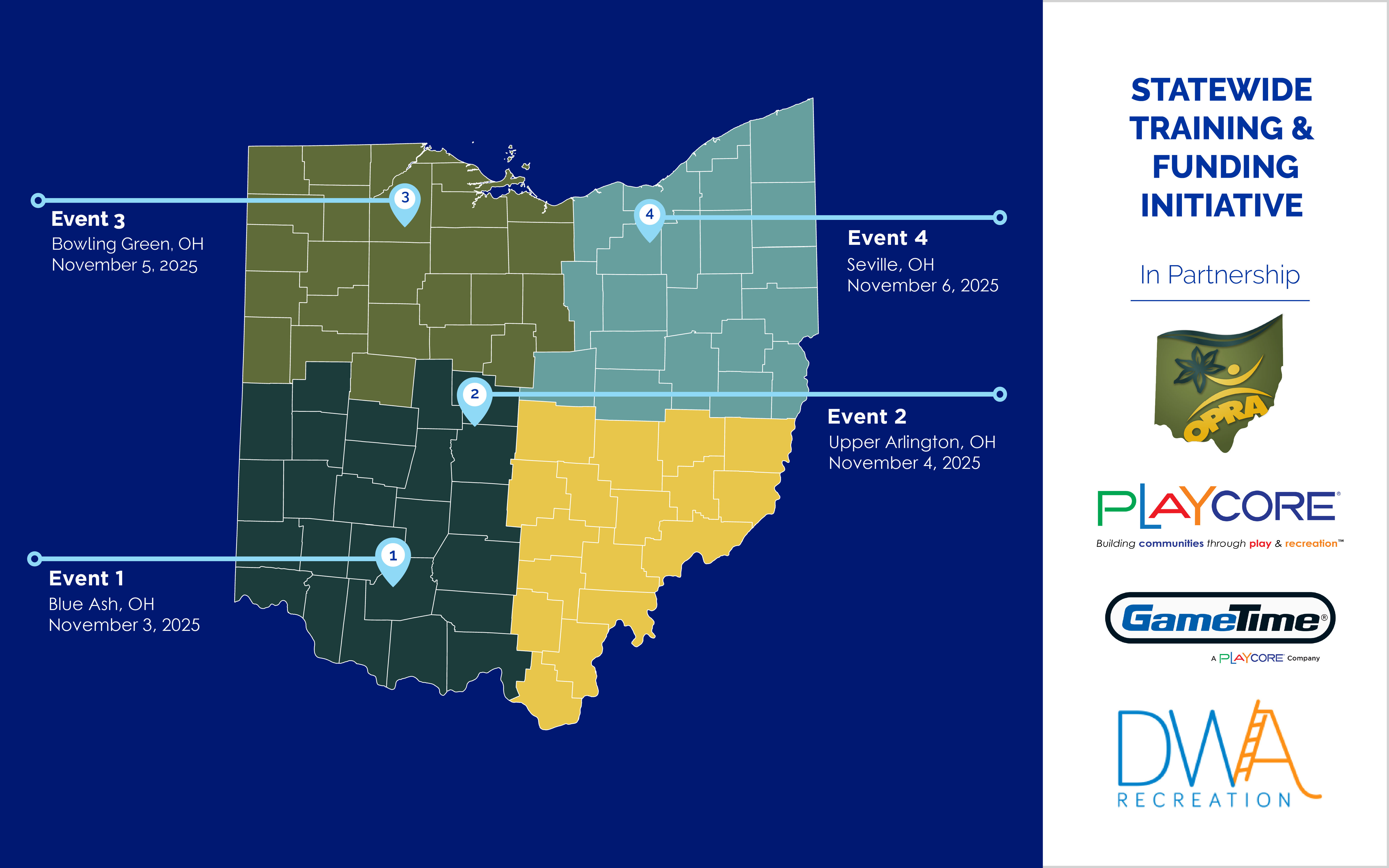 OPRA, PlayCore, GameTime, and DWA Recreation have joined forces through the Statewide Healthy Play Initiative to enrich the quality of life in communities across Ohio. At the heart of this effort is OPRA’s mission to bring people together, support park and recreation professionals, champion investment in community spaces, and ensure strong leadership so that parks and programs can continue to enrich lives across Ohio.